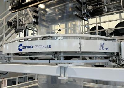 CENTRO-Freeze 2 integriert die beiden Funktionen Kühlen und Folienführung und ersetzt daher den Stützkorb. Somit ist der CENTRO-Freeze 2 besonders platzsparend und lässt sich problemlos in Bestandsanlagen nachrüsten. Neuanlagen benötigen durch die geringe Bauhöhe des CETNRO-Freeze 2 und dessen Kühlleistung eine geringere Hallenhöhe.